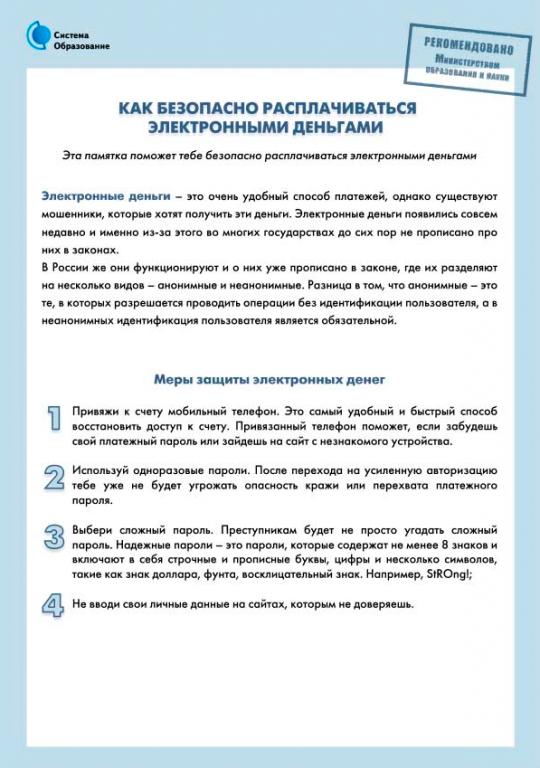 Основные советы по безопасной работе с электронными деньгами: