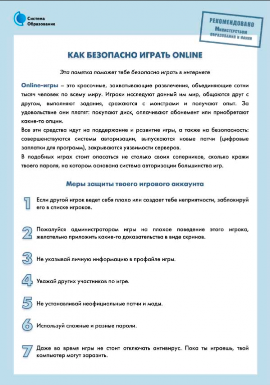 С каждым годом молодежи в интернете становиться больше, а школьники одни из самых активных пользователей Рунета. Между тем, помимо огромного количества возможностей, интернет несет и проблемы. Эта памятка должна помочь тебе безопасно находиться в сети.